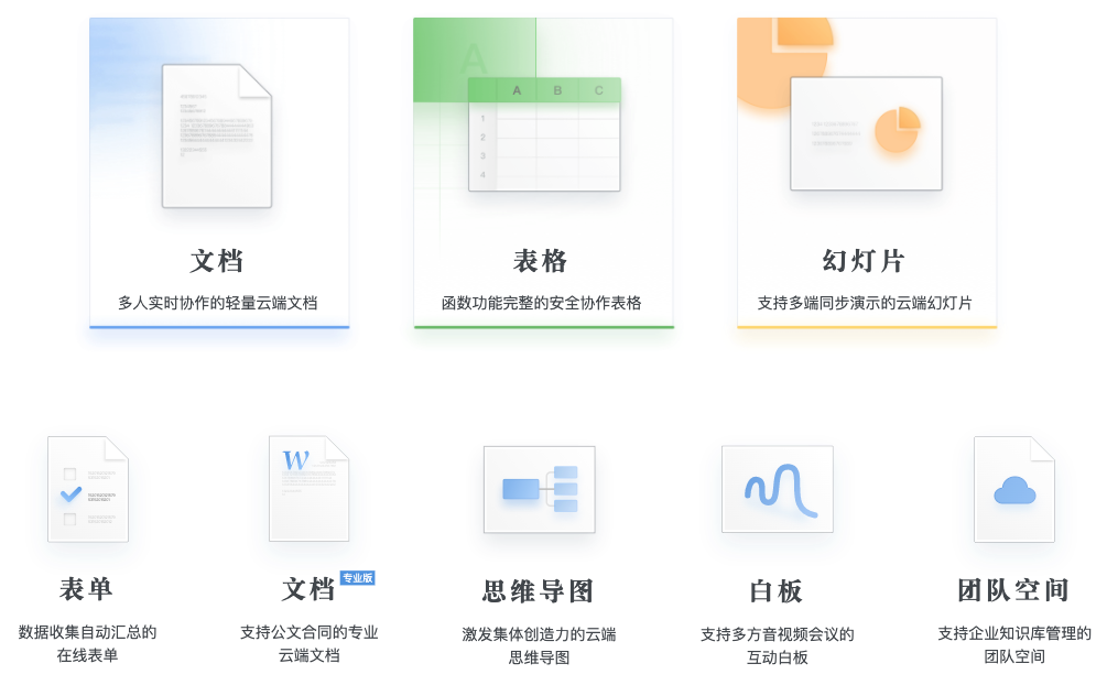 石墨文檔發展至今,已有產品線包含文檔、表格、表單、幻燈片、思維導圖、白板、團隊空間等,基本可以滿足企業辦公場景中的常見需求。
