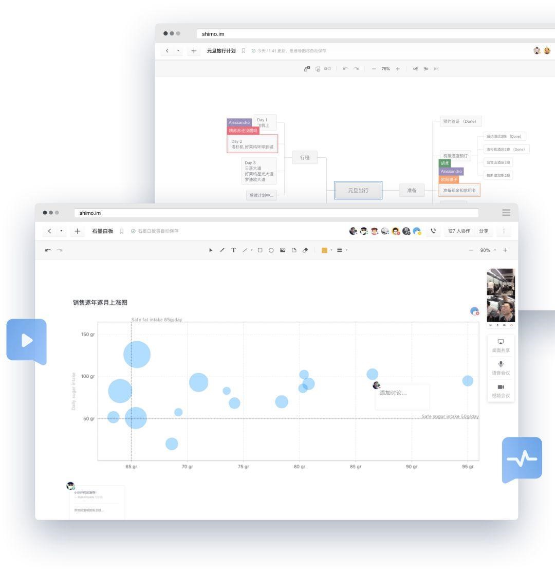 石墨白板讓遠程會議更加高效便捷,多位成員通過音視頻連線,圍繞一個話題各抒己見,邊聊邊寫,邊聊邊畫,討論思路與結果同步呈現。